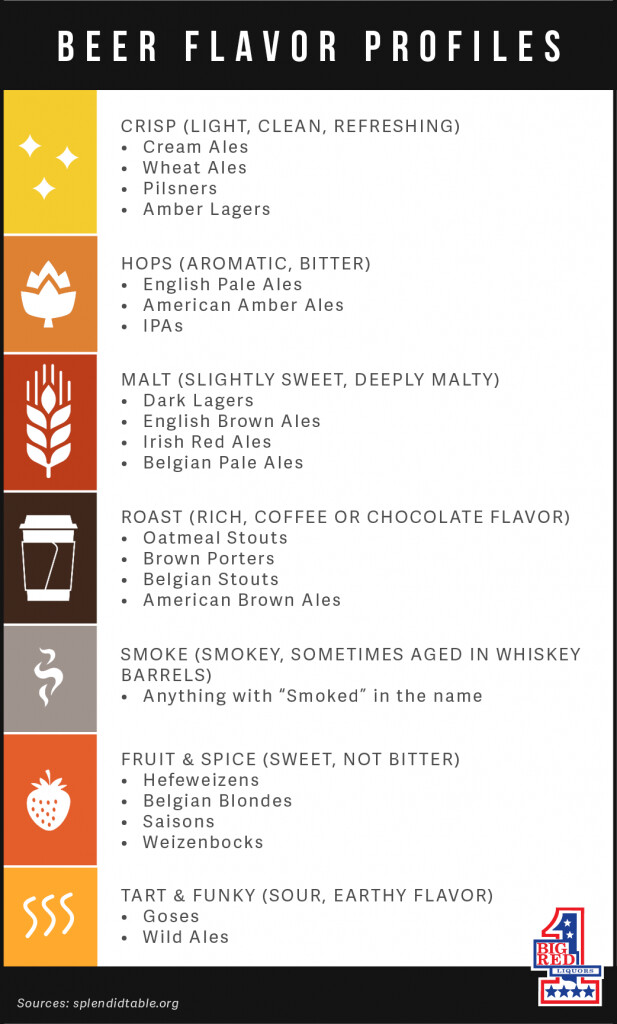 Big Red Guide to Beer Sun, Sep 18, 2022 | beer Beer, glorious beer. Books can, and have, been written about you. So to try and understand everything there is to know about beer in a single blog post is a tall order. And we’re not going to do it. What we can do, however, is give you the basics so you can understand what makes the experience of ales different from lagers and stouts different from IPAs. TWO KINDS OF BEER Here’s a fun trivia fact that not every beer drinker knows: All beer is either an ale or a lager. It comes down to how they are brewed. Yeast is a key ingredient that ferments beer and ales use top-fermented yeast while lagers use bottom-fermenting strains. Also, ales are fermented in warmer temperature, usually around 68 to 72 °F, and lagers ferment in a chillier 45 to 55°F. The difference between the two change the look and taste of the resulting beer giving ales a fruitier or even nuttier taste than lagers. SEVEN KINDS OF FLAVORS Now, there will be some differences of opinion on how to classify differing tastes of beer. For our money, this list from Splendid Table does as good a job as anyone breaking down beer into seven flavor categories. ALL ABOUT IBU (International Bitterness Units) The measurement of bitter hop acids present in a beer is its IBU. For instance, a Cream Ale may have around a 15-18 IBU rating (low) while a German Pilsner may have a 30-35 (medium). American India Pale Ales may see ratings in the 60s while Imperial Pale Ales are often in the 90s. Many consumers tend to build up tolerance the hop acids, so for those new-to-brewers, it is a good idea to keep the IBUs low. There you have it, the quick and easy Big Red Guide to Beer. It’s not complete, but it’s a start. If you have more questions about beer styles or beer pairings, stop into one of our many locations and ask one of our in-store experts. They’ll help you find a great deal on the perfect beer for you and your friends. Share this post Share on facebook Share on google Share on twitter Share on linkedin Share on pinterest Share on print Share on email By Jayne Reed Tags: guide